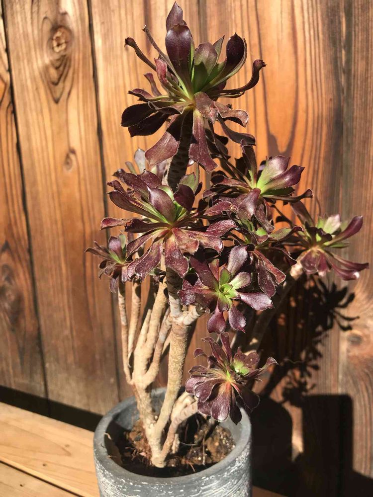 写真のアエオニウム 黒法師(親株)のように長く茎や枝が伸びる多肉植物は、光に向かって茎や枝葉が光の方向に角度を変えていきます。