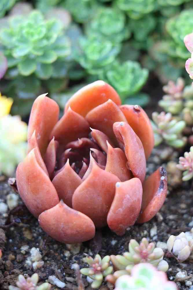 多肉花壇でひときわ真っ赤なコ。名無しで迎えた多肉…あなたはダァレ?