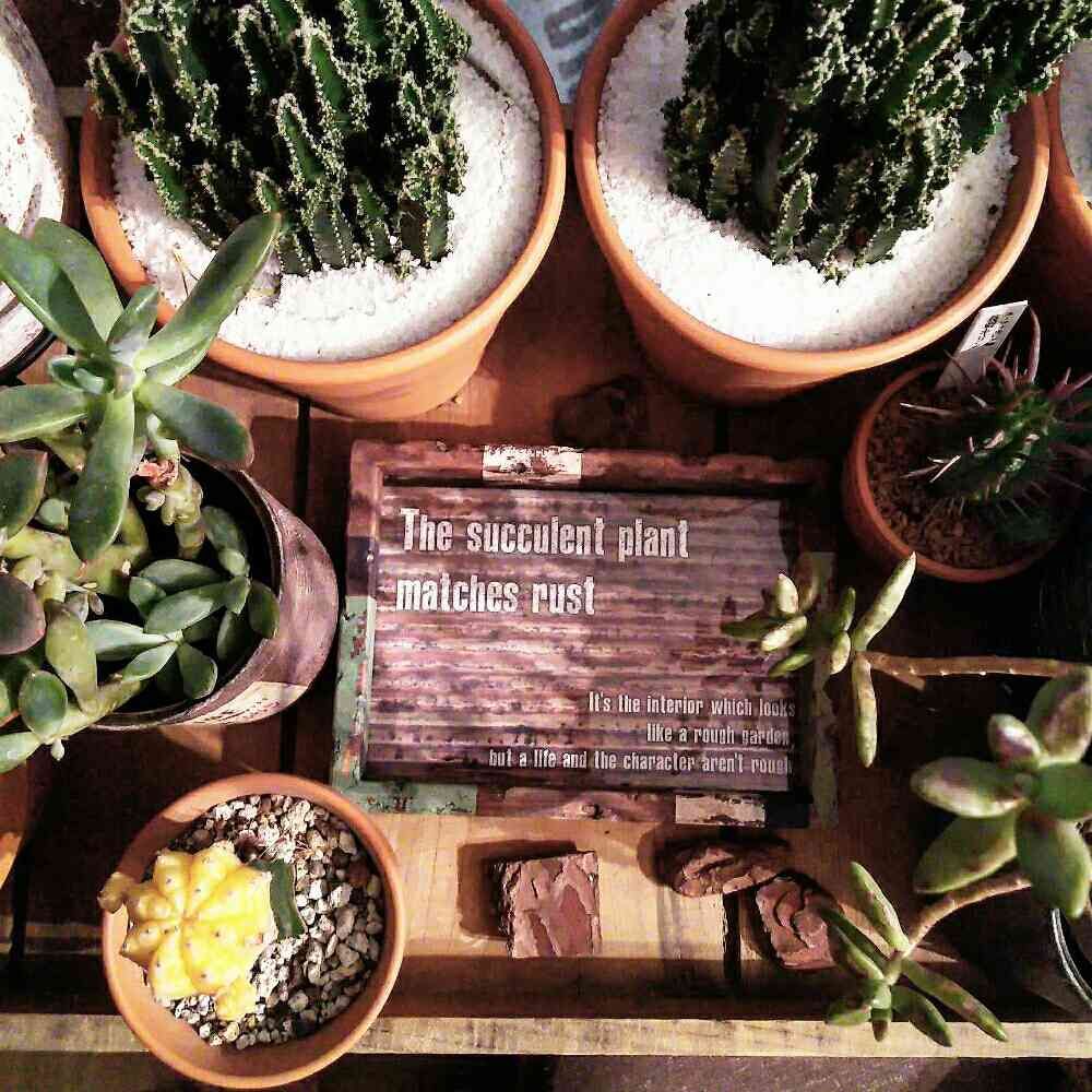 セリアの両面ガラスフレームをスクラップウッド風に加工ペイントして、自作の『サビと多肉は合うよね』ポスカをイン。