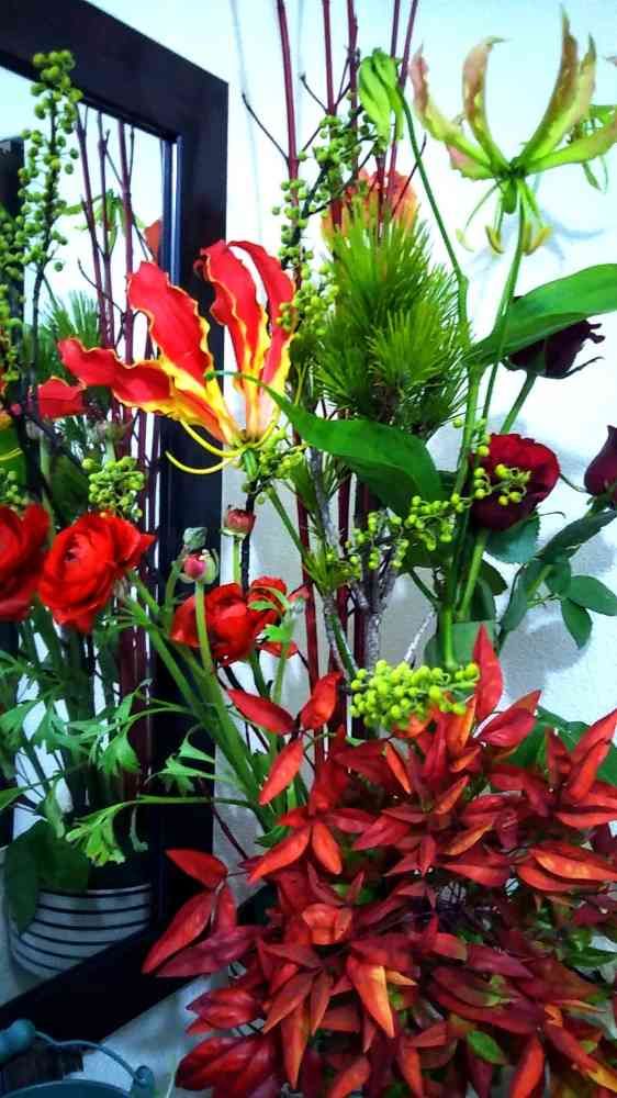 玄関に比べて今回のアレンジは大きくて、後ろのサンゴミズキが上まで