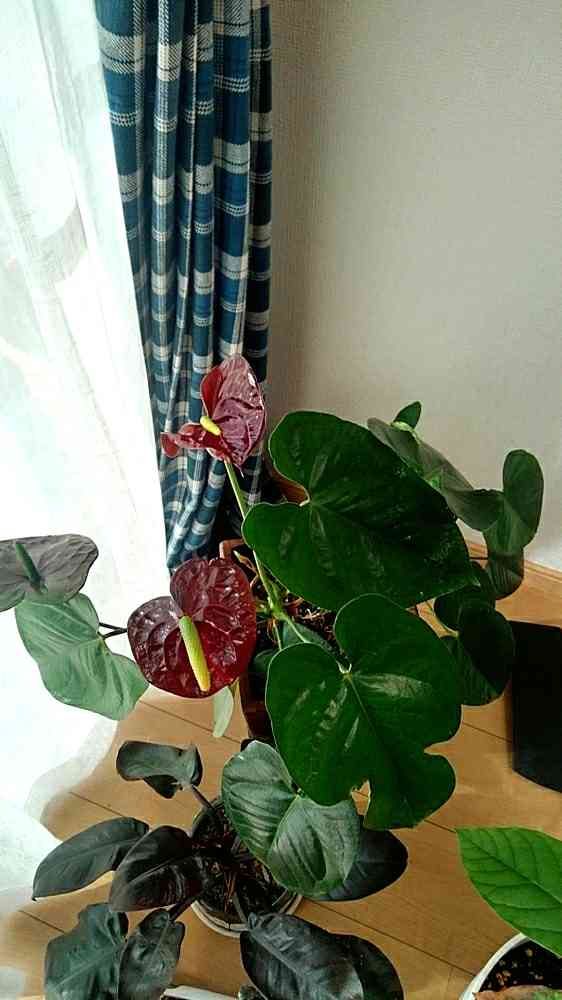 アンスリウムに新たな花が咲いてきました!(一番上のカーテンにかぶってるやつ)😆