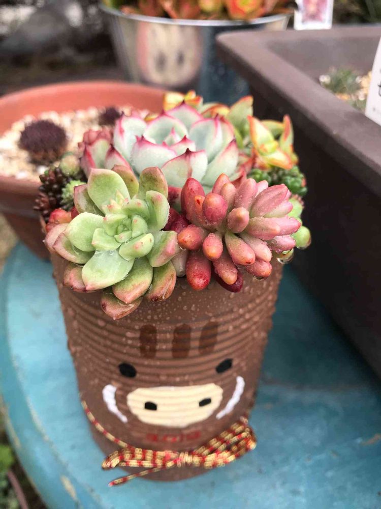 まかろんちゃんからのイノシシリメ缶に寄せ植えしてみました…🌵