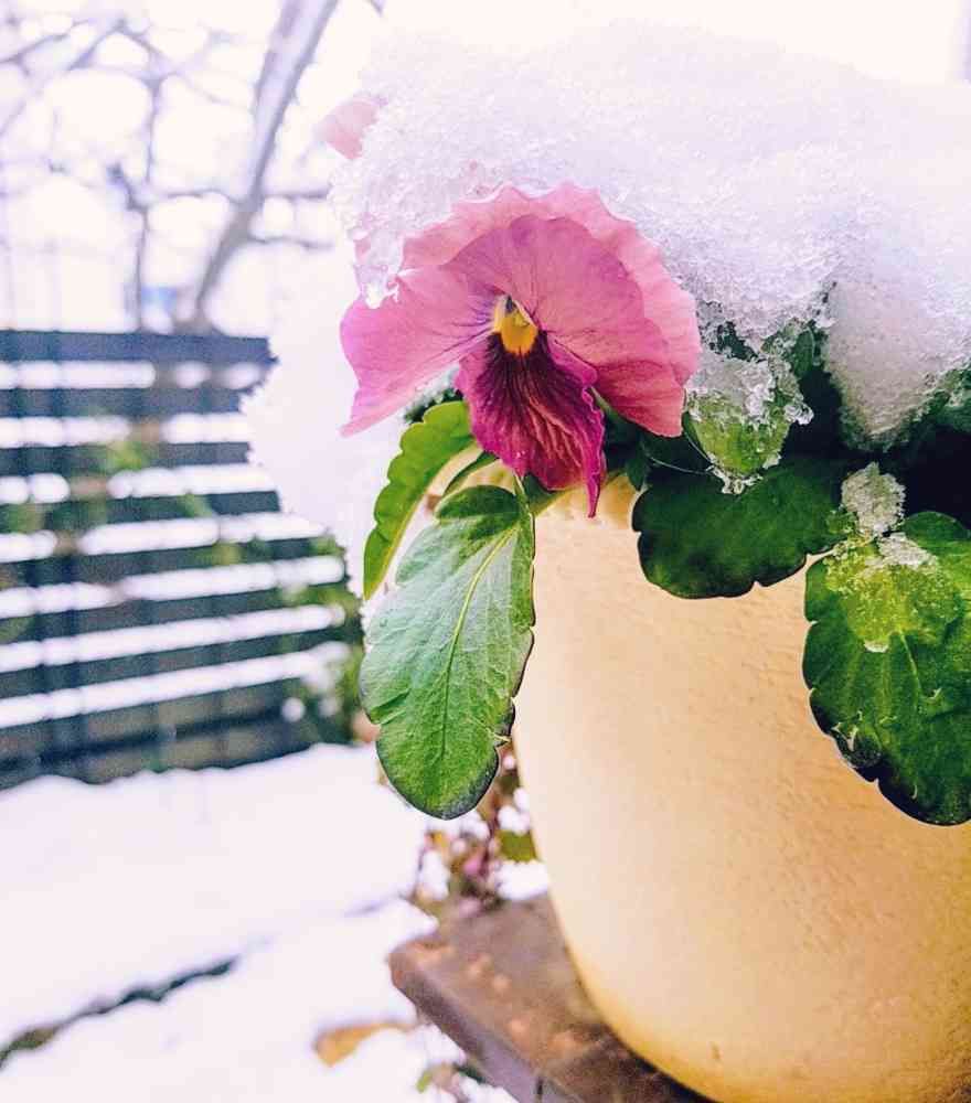 新春早々に降った雪にも負けず咲いていたパンジーにいやされました。今もかわいく咲いています❤️