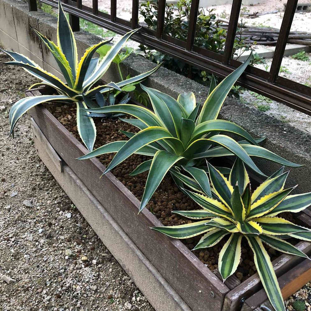昨年6月、玄関アプローチに長めのプランターを置いてそこにアガベを地植え風にしましたが、半年で素晴らしくなりました🙌鉢植えと比べるとノギが違ってきますね。カッコイくなります😊