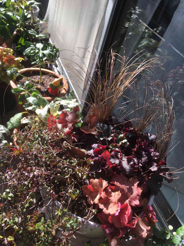 ガーデニングを始めた初期に、色がバラバラで植え付けてしまったヒューケラと、大きくなることを見越さず入れ込んでたクリスマスローズを解体し、ヒューケラ は赤シリーズでまとて、クリスマスローズはお一人様で鉢に植え替え。
