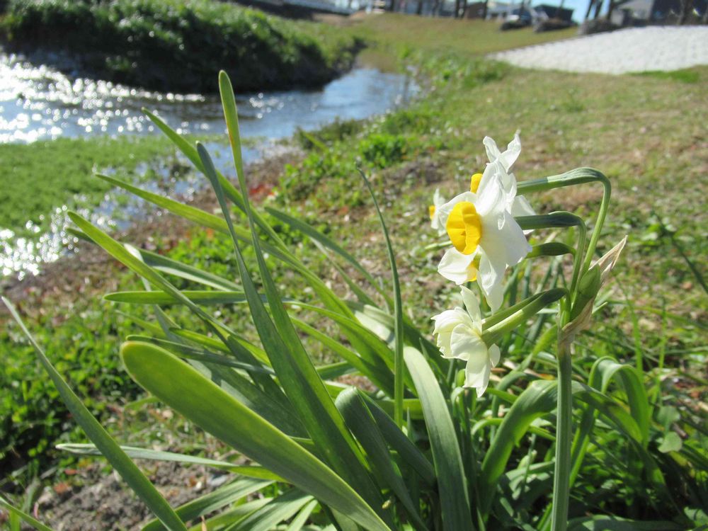 朝陽に光る小川の水面・・・水仙が綺麗でした。