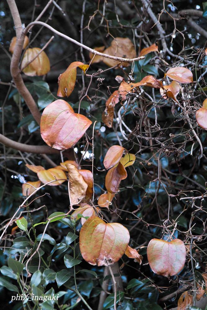 ハゼの木に絡まって登るサルトリイバラの葉が,綺麗な多彩な色に紅葉していました。ルリタテハの食草で,子どもの頃鉢植えにして蝶々を飼いました。