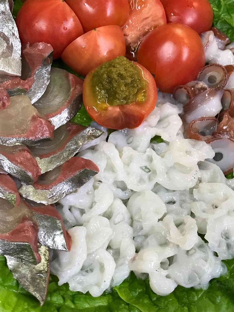 でも刺身でもアメーラに乗せて食べるのがいいんです😋 だって 鯵の女王シマアジ様ですもん❣️これが硬めのアメーラトマト🍅が合うんです🤣😋