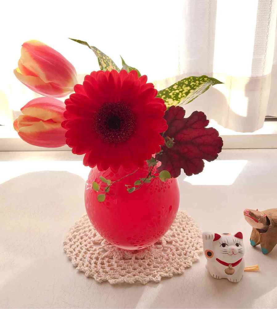 赤いお花に ステキな赤いガラスの花瓶❤️❤️
