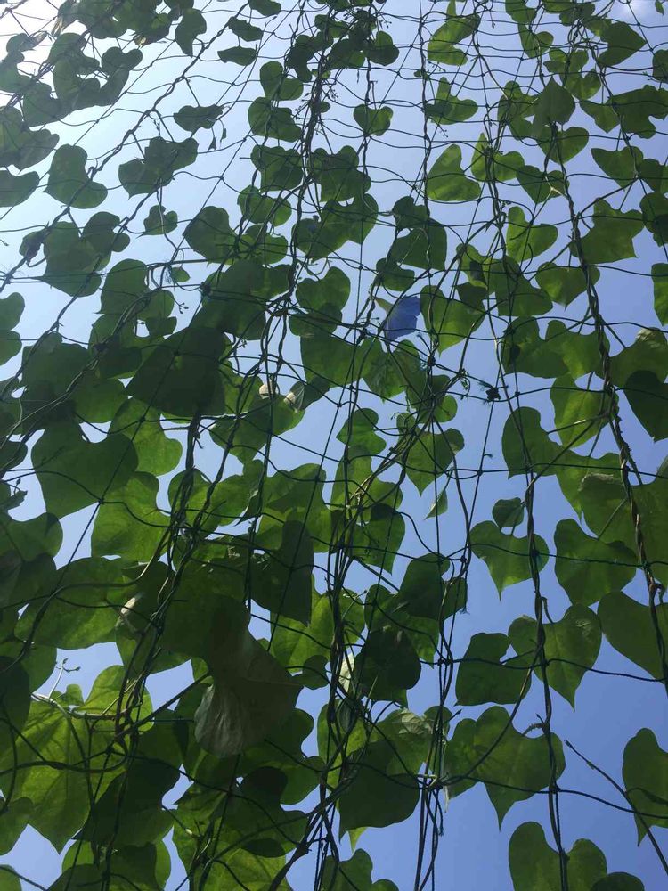 少し前にも同じ投稿をしましたが、摘芯をせずに一直線で伸ばしてしまい、スケスケ、レースのカーテン以下で、日陰ありません(笑)