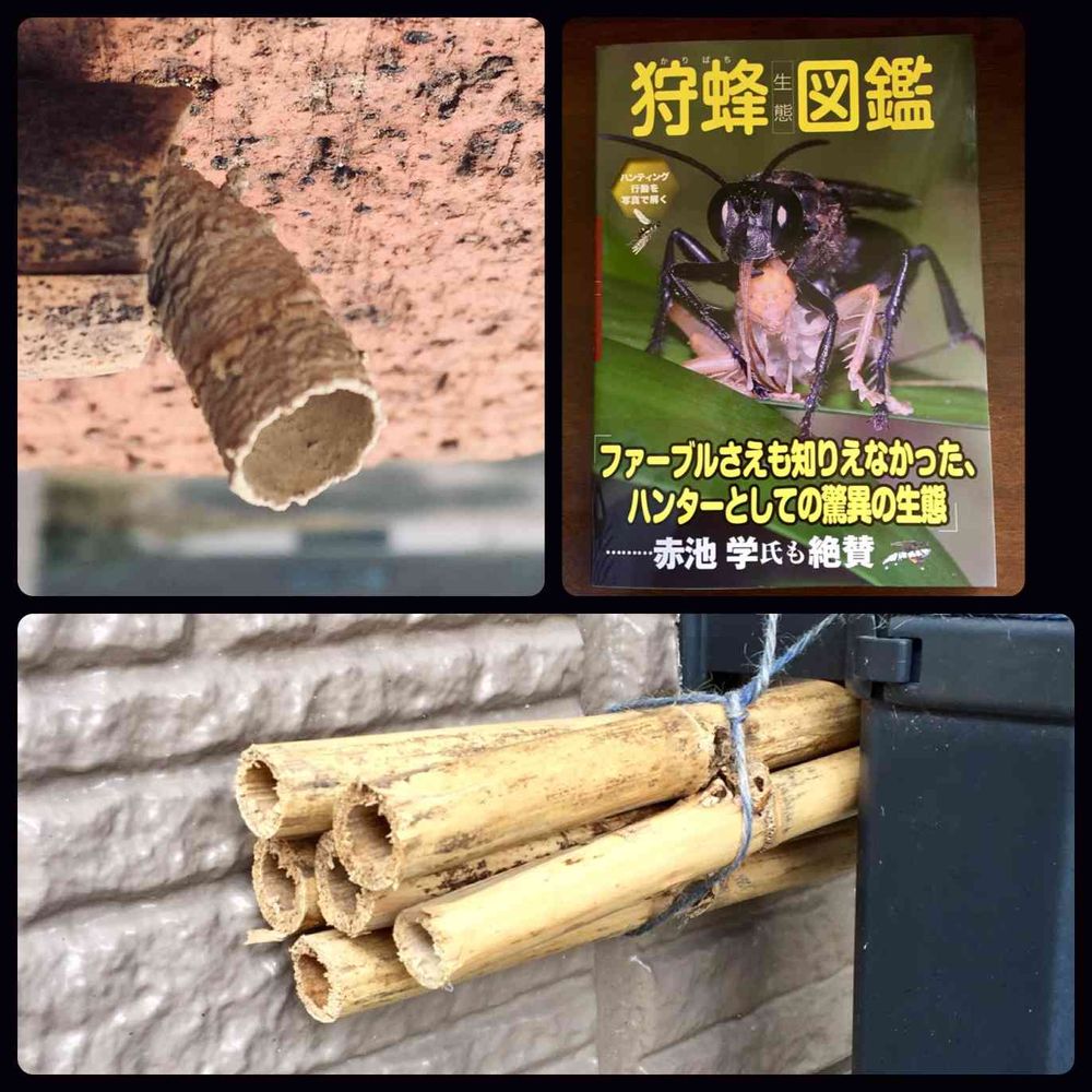 一昨年設置した蜂宿を取り替えようと解体したら、見事な煙突が付いていました🤩(左上) エントツドロバチが子育てをしてくれた証拠です🐝 蛾の幼虫を狩ってきて麻酔をし、この筒に詰め込んで子供のエサとするのです。今年もこうした狩蜂たちの働きに期待して宿を新設しました(下) ちなみに右上は愛読書。とてつもない労作で、見事な写真が満載されています✨