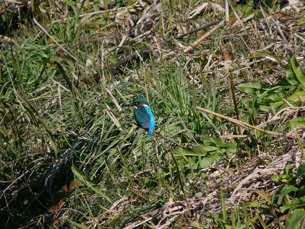 車で走っている時に、ふと田んぼの畦(あぜ)を見たら、青いのが居た。