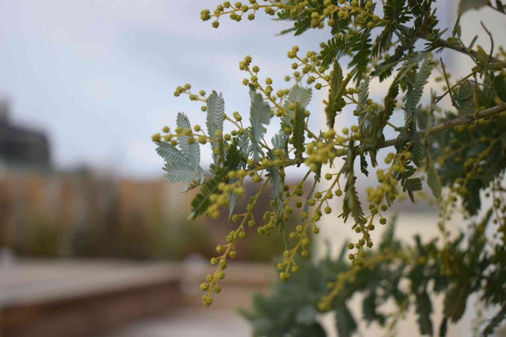 屋上テラスのミモザが、いっぱいいっぱい莟をつけている。