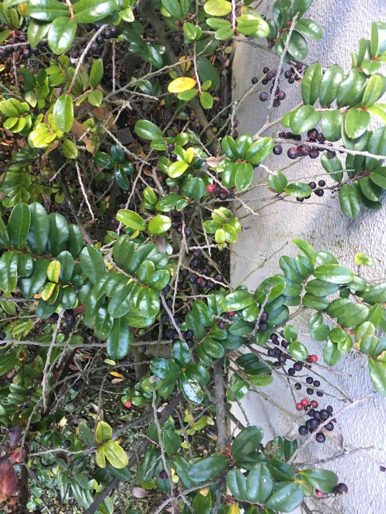 マンション植え込み。冬になると赤い実と黒い実をつける低木があります。子供達がよく実をちぎって遊んでいます。そういえば、この木の名前、なんていうんだろう❓