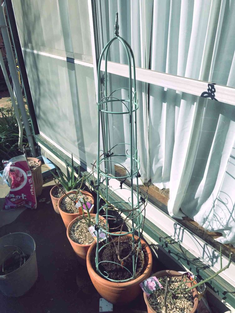 で、本題のオベリスク仕立てのクリスティアーナ。いま持てる知識の全てを注いで品種を選び、処置をし植え付けました。もうちょっと綺麗な場所で撮りたかったけど、写真のためだけに移動するのは面倒だったので。重いので腰も不安だし(^^;) 綺麗に咲いたらちゃんと撮ってアップします。