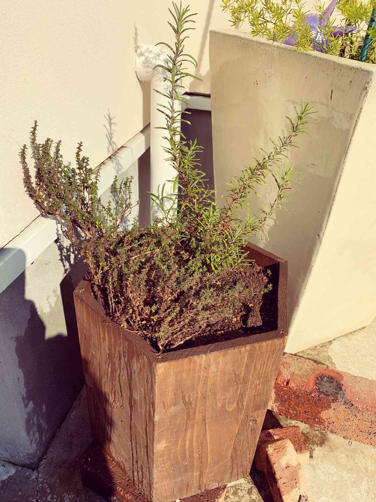 地植えのタイムとローズマリーが増えすぎたから鉢植えにもしてみた。