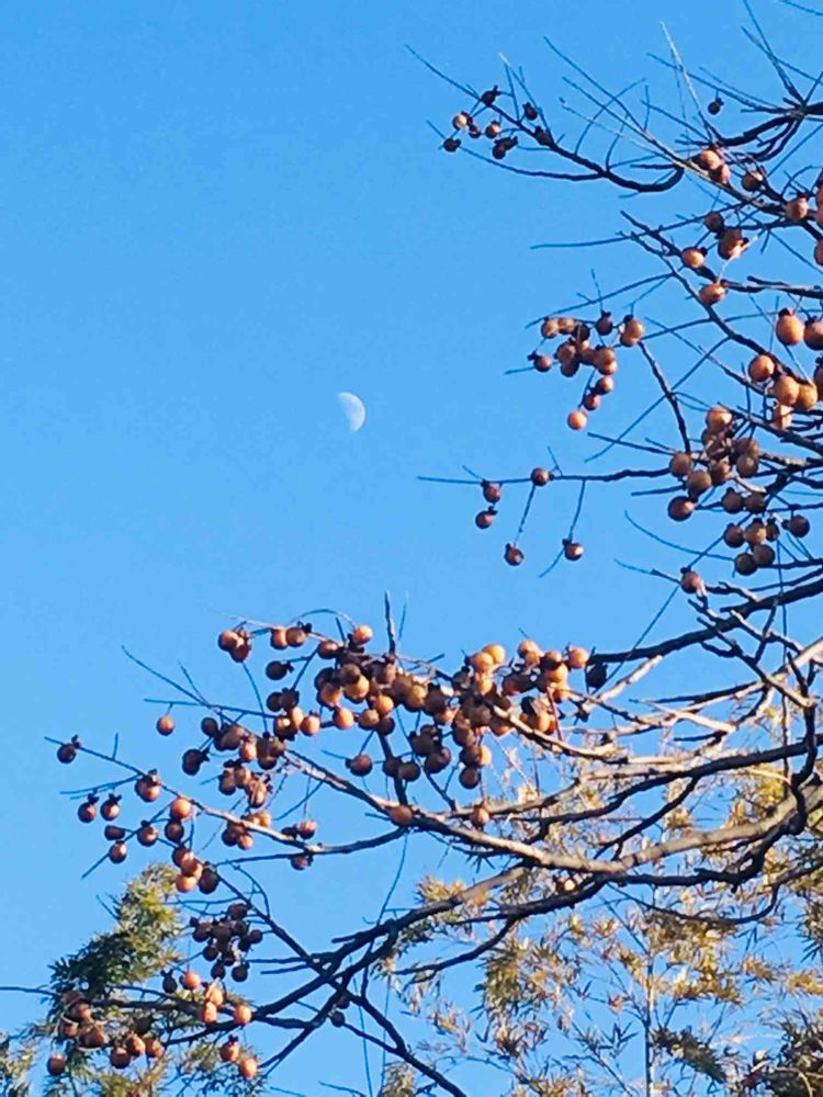 買い物に行く途中、「センダン(9月にアップしました)もすっかり冬姿だなぁ〜、🤩🤩青空に映えるなぁ〜😍😍」などと思いながら見たら、月🌛まで❣️