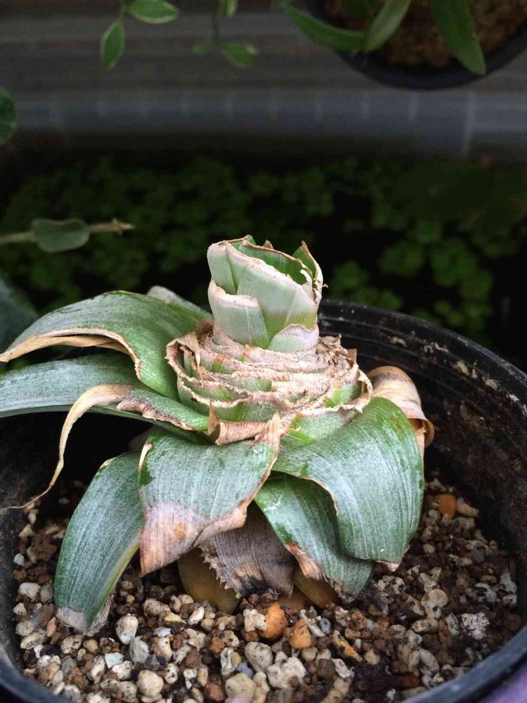 真っ直ぐ切ってあった葉っぱが真ん中の方だけ伸びてきました