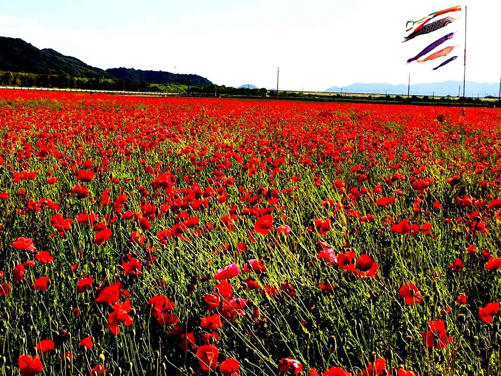 赤いポピーと鯉のぼりが絵画のようです😌💕👌