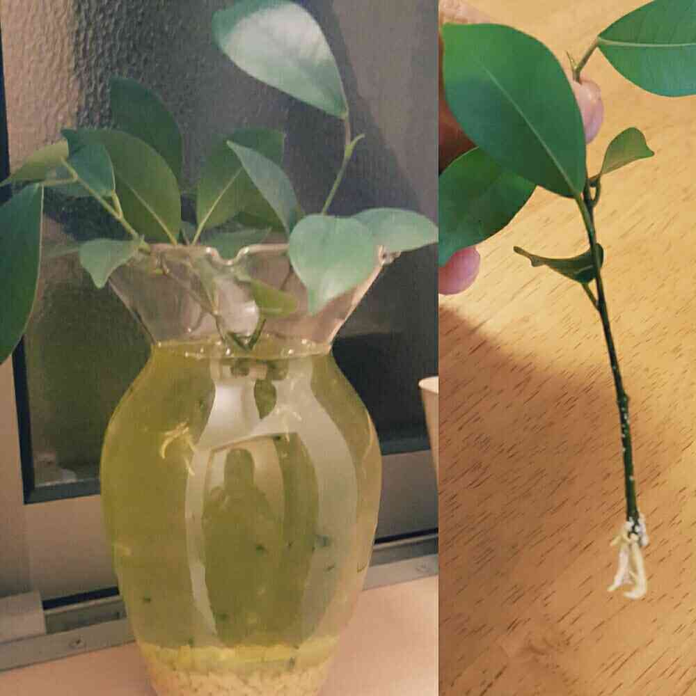 切ったガジュマルの枝を水に挿していたら根が生えてきました~⤴(藻もたくさん生えてきたけど😅)