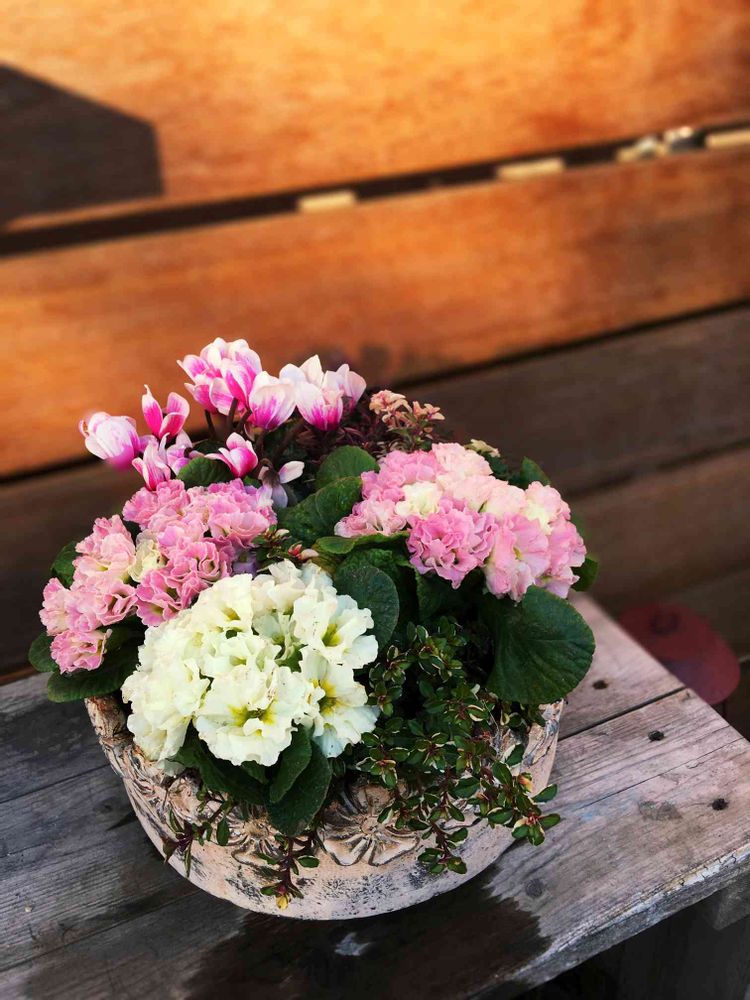 おはよんございます😊 かわいいピンク色の寄せ植え〜花びらもヒラ〜ヒラかわいいですね〜😆春が待ち遠しいですね〜🤗