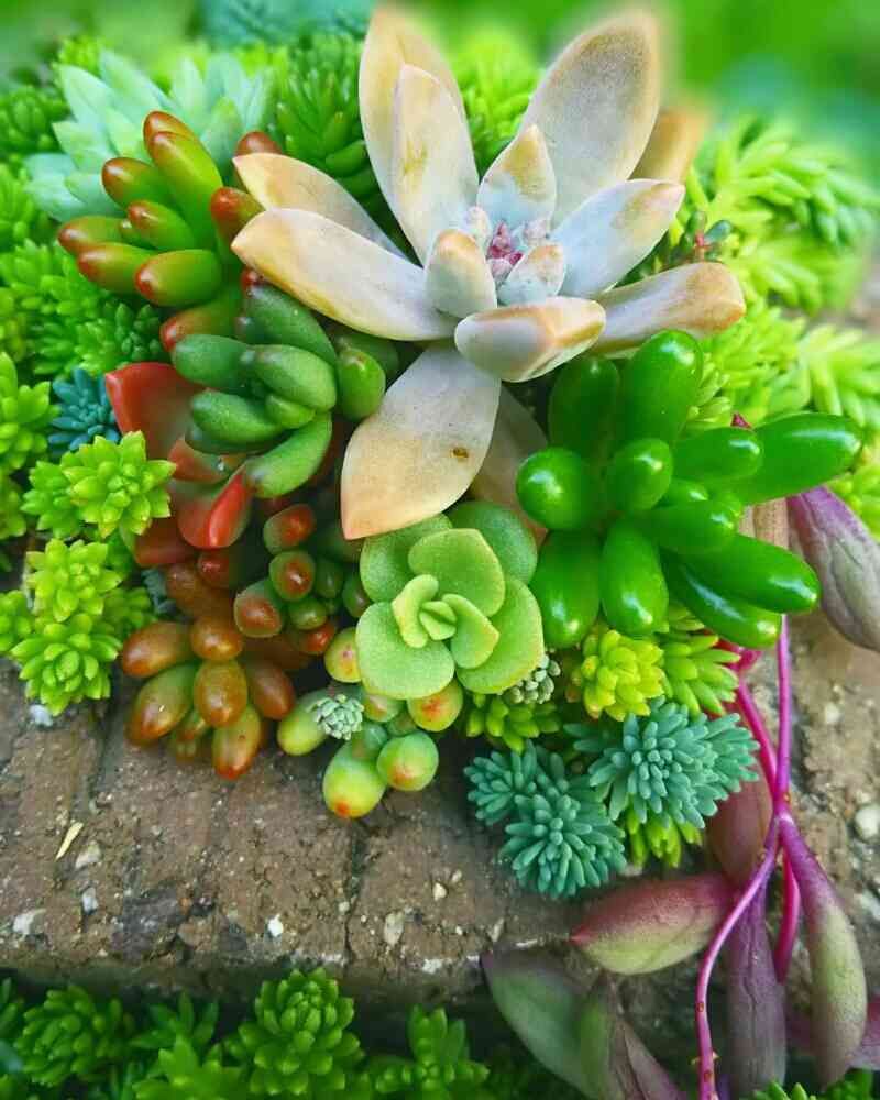 セダム畑に置いた穴あきレンガに寄せた多肉たちも暑さに負けず凛としてます‼