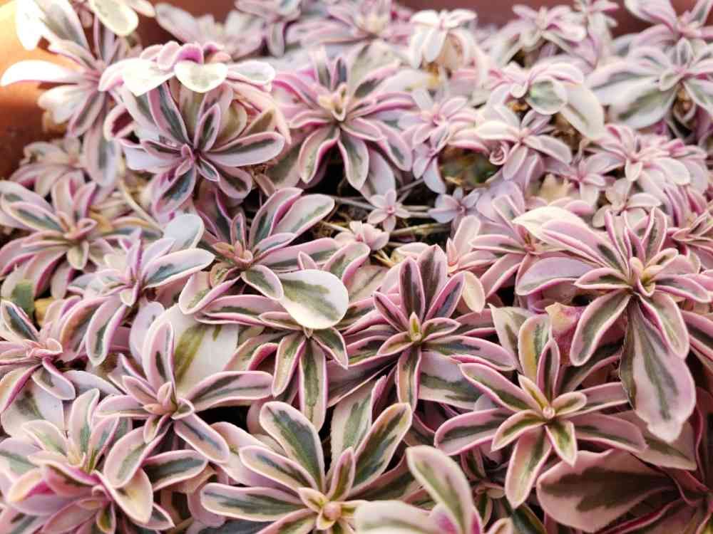 春夏は緑に白の斑入り葉だけど、寒くなるとピンクになるんだょ。