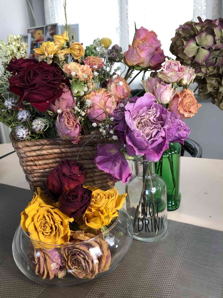 昨年から花束💐をたくさん頂く事が多い年末でしたので…お花の綺麗さが愛おしくドライに挑戦❣️シリカも使いましたが北海道の室内の方がアッと言う間にドライが出来ました😅それだけ乾燥してるのよね〜🤔