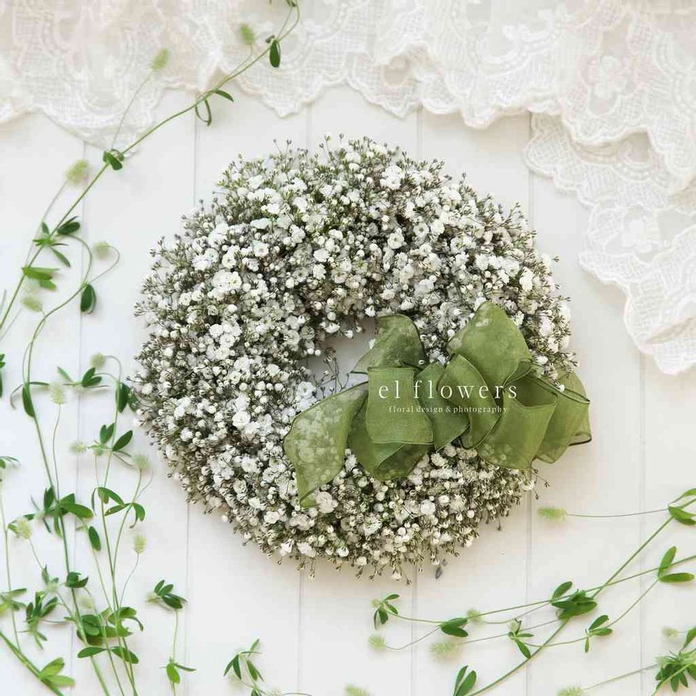 これはリースの土台に細いワイヤーでかすみ草をぐるぐる巻いていってるんですよ😄
