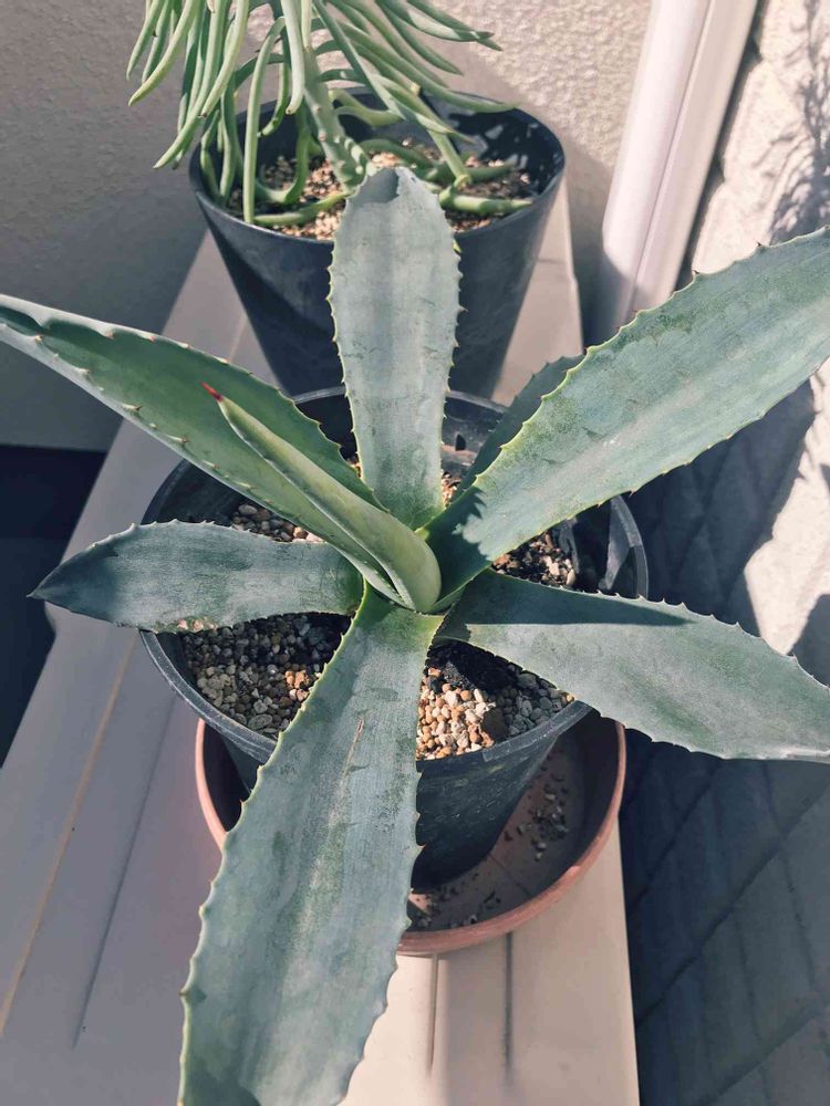 只今、夜間はエアコンありの寝室に移動中のアガベ。調子良い!昼間はベランダで日光浴☀️