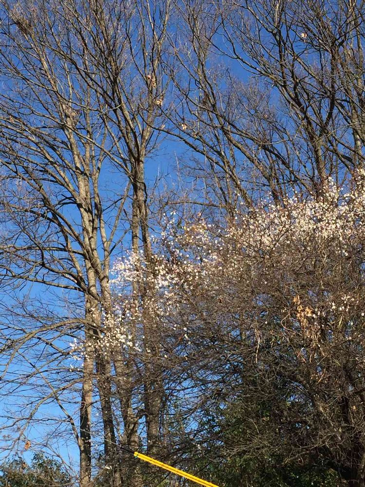 裏山です。ブナやどんぐりの木は、葉がありませんが、梅が咲いてきました。