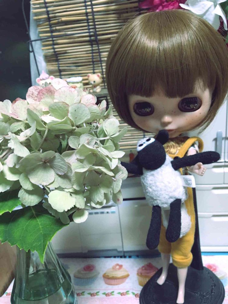 ドライにしようと思って、摘んだアジサイ。綺麗なんで飾ってる2人。もっと近くで見たい!抱っこして〜〜と、ショーン。