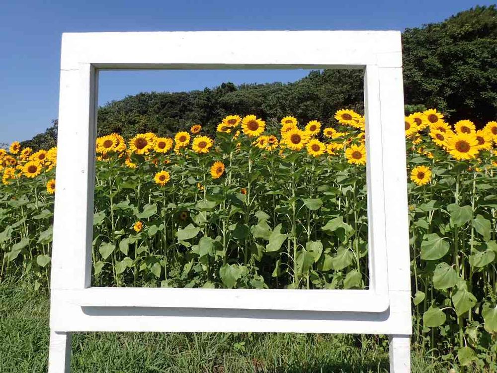 12000本の「ヒマワリ ビンセント」ですが、ゴッホにちなんだヒマワリとのことで「額」を設置しています。これを使って写真を撮るとゴッホの絵の中に入り込んでいるような…!