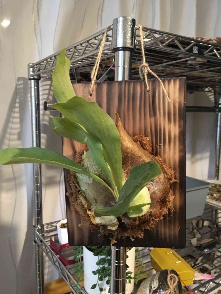 ビカクシダが欲しくて探していたんですが、お友達がホームセンターでプランターのを買ってきてくれたので、杉板を買ってきて、焼いて、バラした株を板付にしてみました(o^^o)