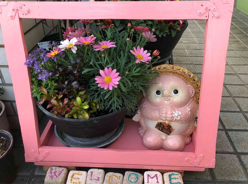 素敵なピンクの額縁ですね❣️お話の緑やピンクの花、狸?猫?の置物とも合っていますね❗️
