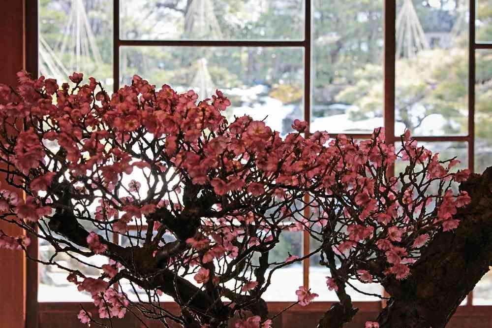 紅梅満開💞見事に咲き誇る古樹の背景は美しい中庭透かす格子窓。