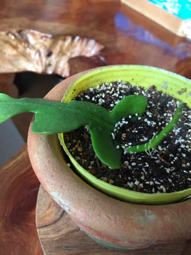 フィッシュボーンカクタスを娘に持って帰られる前に先の方を切って、葉挿ししてみました。芽が出てくれて良かった。ハンギングに、仕立てるのが楽しみです。