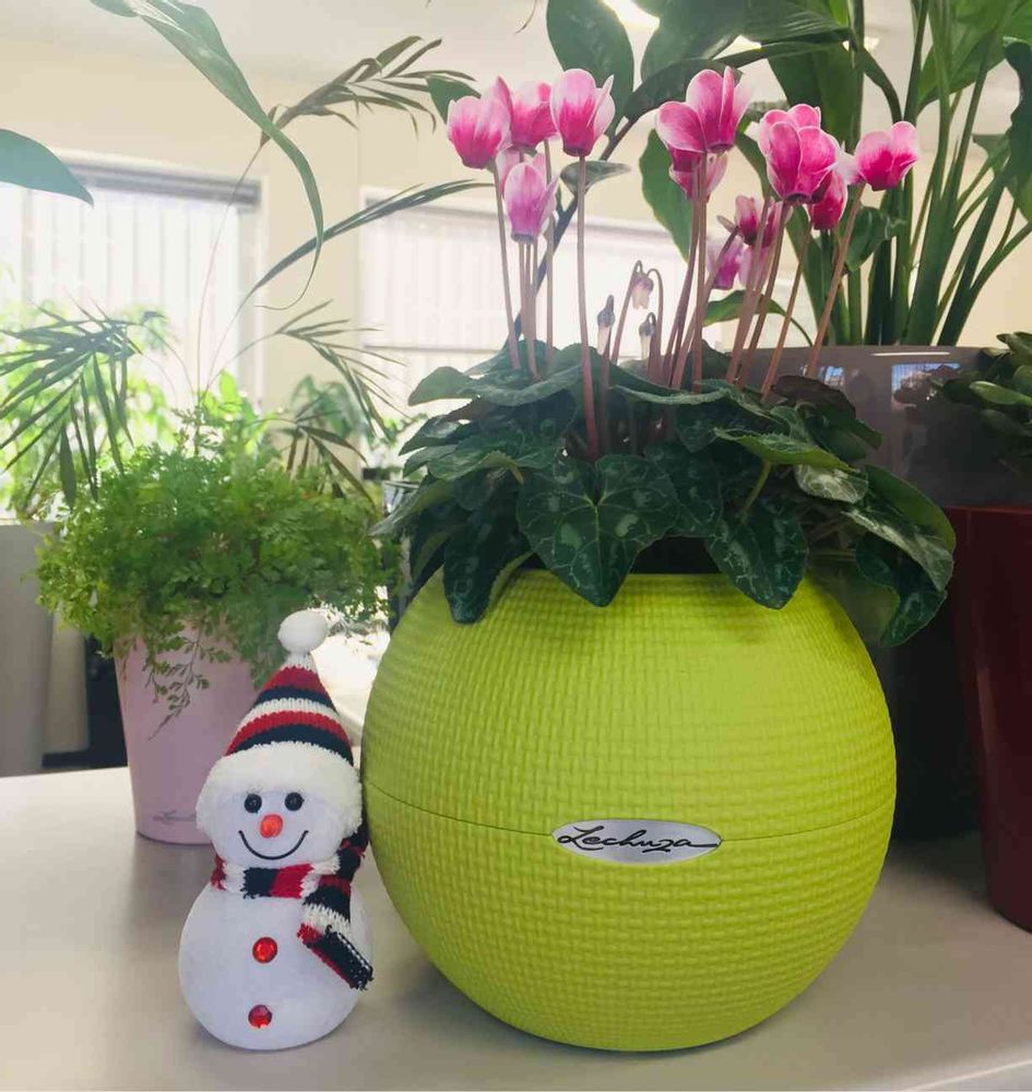 シクラメンの栽培に最適な底面給水鉢・レチューザに植わっています。コロンとして球体型のこの鉢は「ピューロ」というシリーズ。