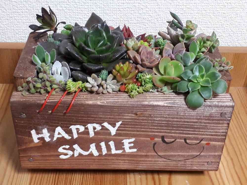 まち子さんから頂いた木製プランターに寄せ植えをしてみました。