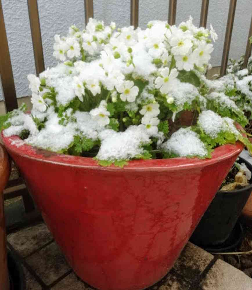 プリムラ・シネンシス春風桜「白波」です。2016年春先に降った雪に埋もれてしまったときの写真です。別名雪桜とも呼ばれるほど寒さに強いので、雪に覆われてもへいちゃらでした。