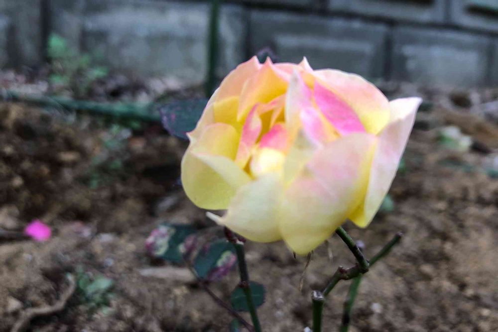 この黄色のミニ薔薇は色が変わるのです。鮮やかな山吹色から優しいクリーム色に。そして赤いアクセントがいろいろに出ます。