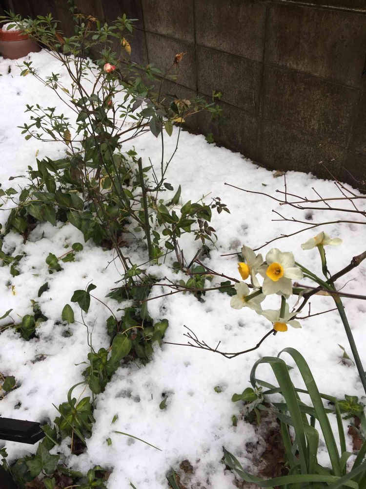 昨日から降った雪で水仙の花🌼も