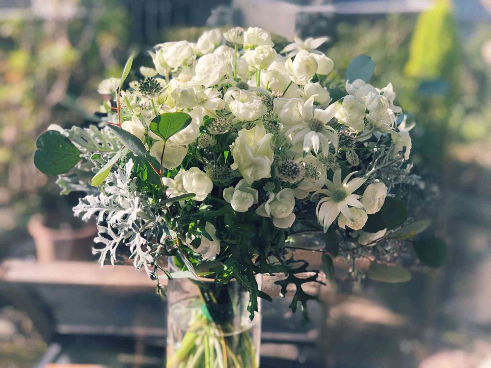 寂しくなりすぎないよう、仕上げのラッピングはクリーム&生成りで温かな色味をプラスしました。