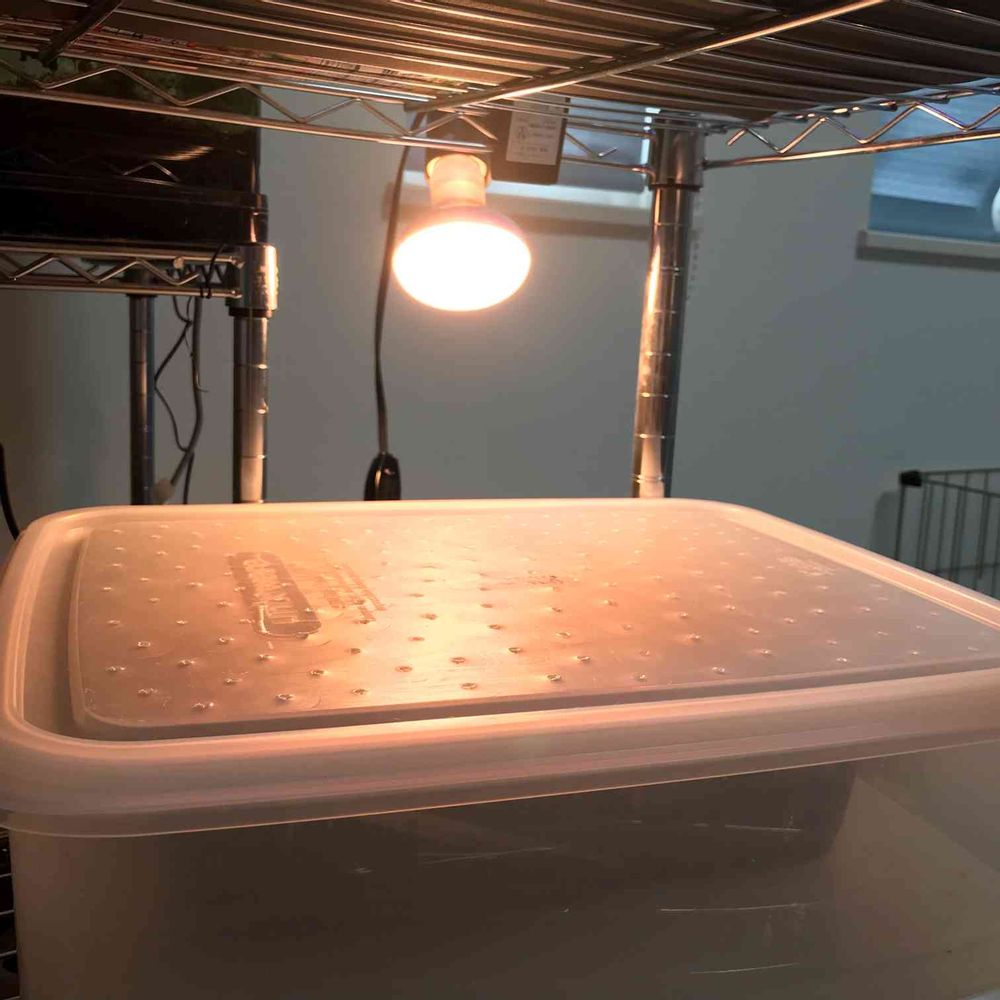 こんばんは!ごちゃごちゃ失礼します汗 蓋はサランラップなど透明度が高いものにした方がいいと思います!発芽に必要な光量は意外と多くて、この蓋だと今まで十分な量の光を種が得られていなかった可能性があります。ガンガン光を当てるくらいで大丈夫です(ライトの熱で熱くならない程度なら)。