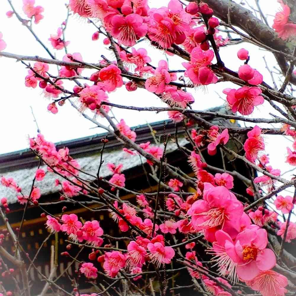 今朝の大宰府天満宮の紅梅🌼屋根にうっすら雪が…🌨️