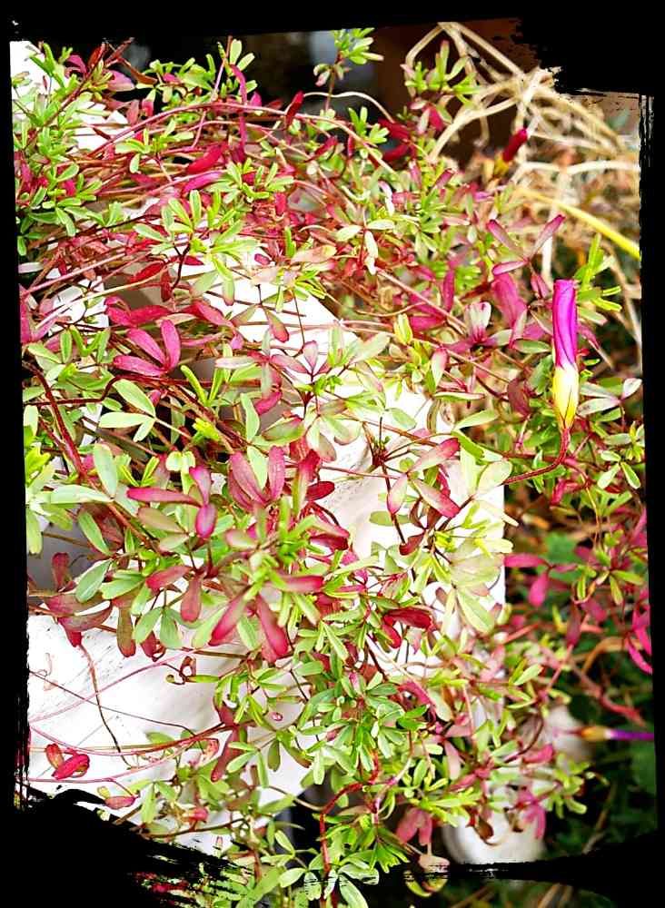 太陽を求めて伸びて、鉢からはみ出した姿をしてますが、葉っぱまで花と同じ色♥️