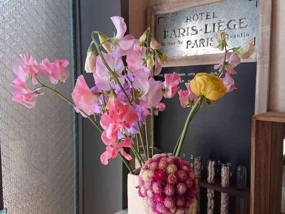 とっても、綺麗♡ それに、活きがいいね♬ 香り嗅いでみたい💕 ラナンキュラスと丸く赤いボール状のお花は何のお花だろう、スイートピーと、とっても合ってるね😄🎵