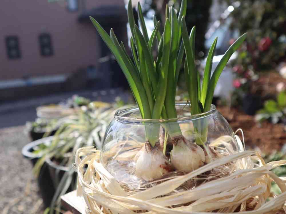 芽出し鉢の球根を100均のガラスの小鉢に入れてみました。