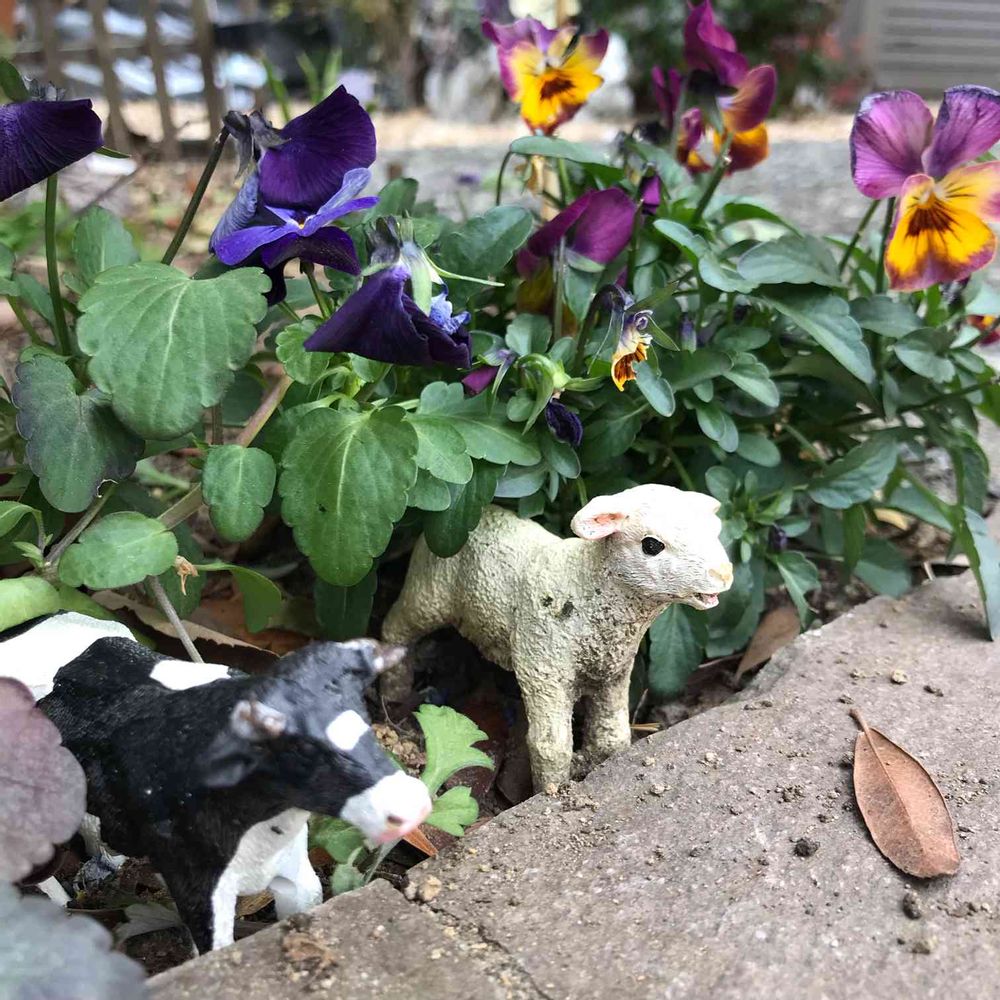 玄関前花壇のビオラの中で羊とアルパカがかくれんぼしていたのですが、今朝見たらアルパカが居ない❗️