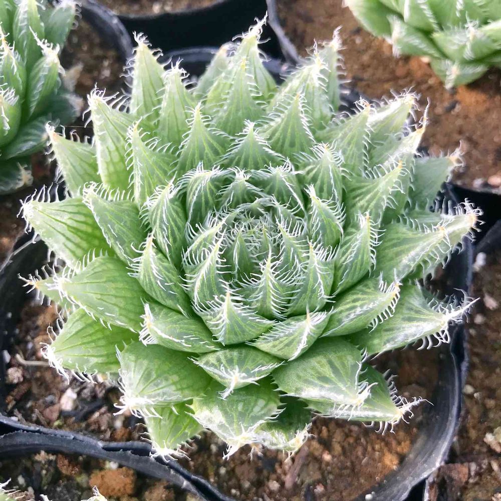 羽衣は、葉の縁(ふち)に細長い白い毛が生えており、透明窓の筋模様と相まって繊細で美しいハオルチアです。